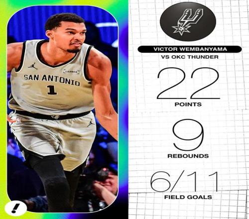 ——文班亚马,替补打了26分钟,投篮12中6,拿了19分11篮板2助攻1抢断1盖帽,正负值达到+13,攻防两端统治力都极强,特别是防守端,亚历山大突到内线,看到文班亚马协防都要紧急将球传出去