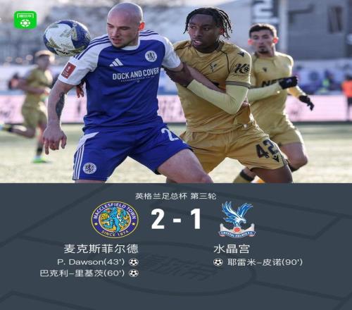北京时间1月10日英格兰足总杯 第三轮,麦克斯菲尔德对阵水晶宫。麦克斯菲尔德P. Dawson破门,巴克利-里基茨破门。水晶宫耶雷米-皮诺破门。最终比分麦克斯菲尔德 2-1 水晶宫。