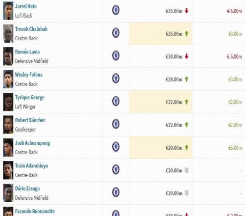 切尔西球员身价变动:埃斯特旺上涨2000万欧,德拉普下跌500万欧